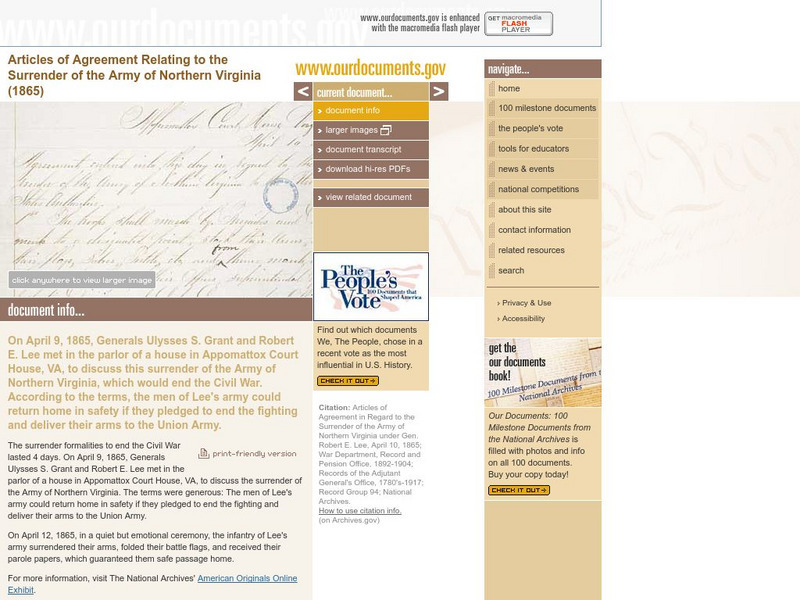 The document outlining the terms of surrender, agreed upon by Generals Ulysses S. Grant and Robert E. Lee, which ended the Civil War in 1865. Interactive image accompanied by background information and transcript.