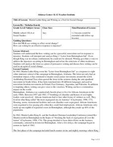 Students explore writing as an agent for social change. In this Social Studies lesson, students examine the power of writing using Dr. King's Letter from a Birmingham Jail. Students will practice the technique of persuasive writing...