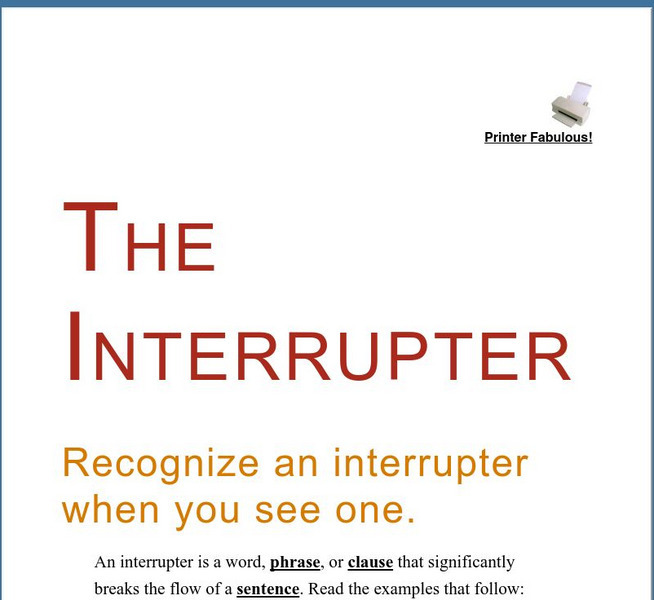 Printable information is provided that demonstrates how to identify an interrupter in the context of a sentence.