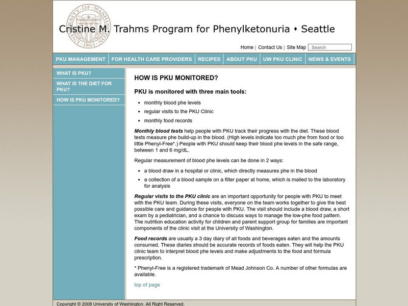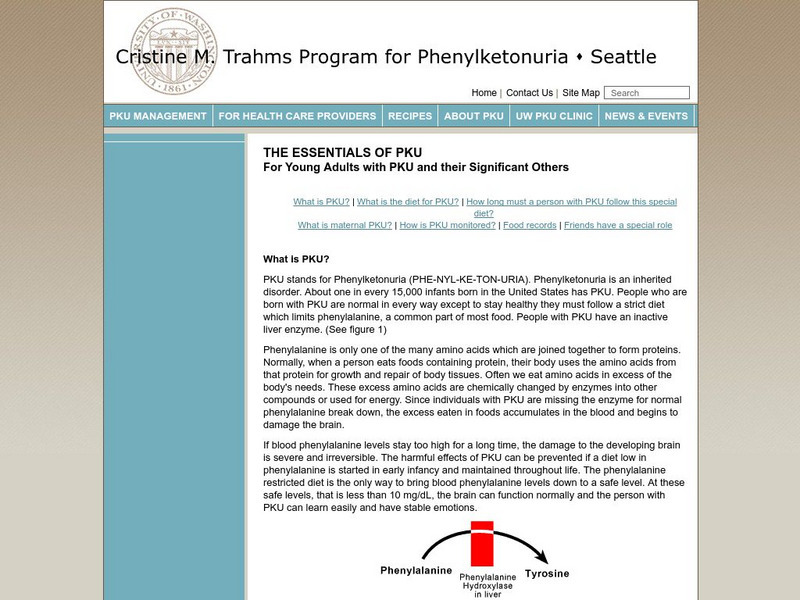 The Texas Department of Health provides a site about phenylketonuria (PKU). The site discusses what it is, how it can be treated, and how a person gets PKU. Some important facts about the condition are presented as well.