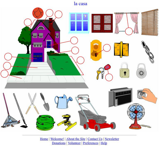 These colorful pictures model vocabulary pertaining to the external parts of the house, windows and a few appliances for upkeep of the garden. Interactive audio and written vocabulary appear when the mouse is moved over the illustration.