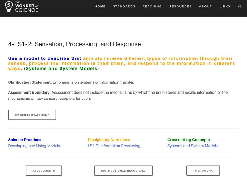 Work samples, phenomena, assessment templates, and videos that directly address standard 4-LS1-2: sensation, processing, and response.