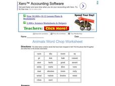 In this animals word puzzle learning exercise, students examine 26 word parts and combine those parts in order to create as many animal words as possible.