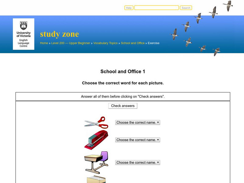 Nice vocabulary development tool for students. Matching exercise shows pictures of common items from school or office. Student tries to match correct word with picture from drop down menu. After 10 questions a score based on correct...