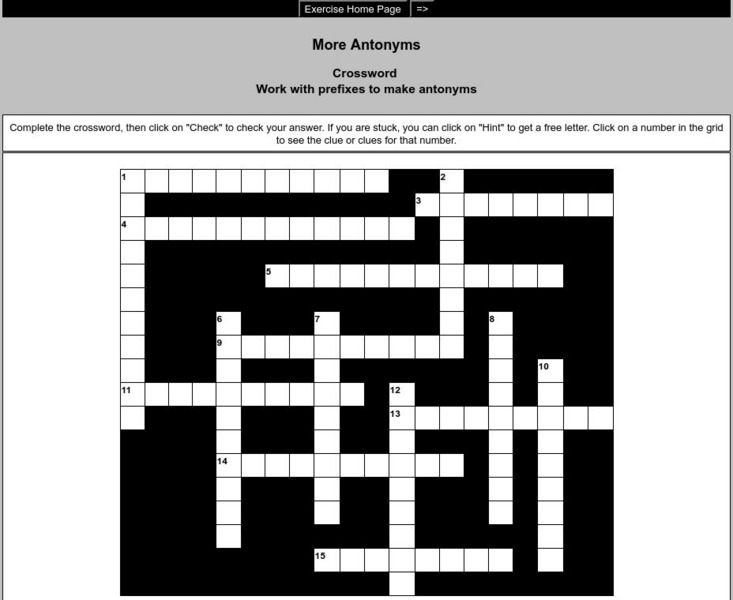 Solve this crossword puzzle by using prefixes to create antonyms of the words given in each clue. Hints are available if needed, and answers can be checked when the puzzle is finished.