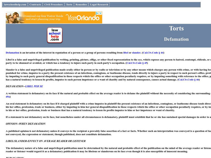 Learn about defamation, "An invasion of the interest in reputation of a person or a group of persons resulting from libel or slander." This website provides definitions of both libel and slander, and addresses the role of defamation in...