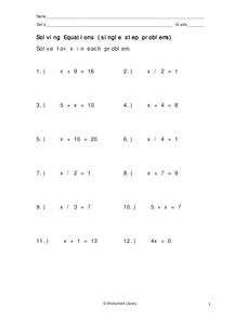 In this practice worksheet, students solve simple algebraic equations containing one variable. They use their integer rules, addition, and multiplication principles to solve the equations. There are 54 equations on this two-page worksheet.