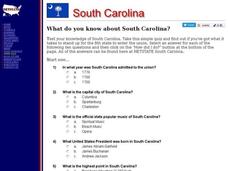 In this online interactive South Carolina activity, students respond to 10 multiple choice questions that require them to exhibit what they know about the state. Students may submit their answers to be scored.