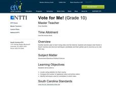 Tenth graders analyze voter trends in South Carolina and discover techniques canddidates and their parties use to convince us to vote their way. They are able to locate voting statistics for their county; compare the number of...