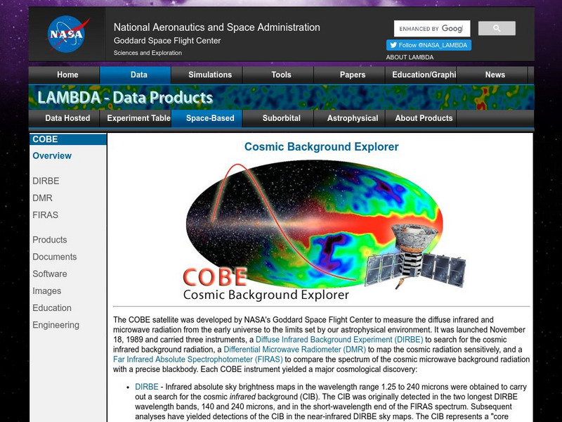 The Cosmic Background Explorer, or COBE, satellite began its space mission in November of 1989. Its task was to measure radiation levels from the early stages of the universe. This site explains the mission goals, COBE's specialized...
