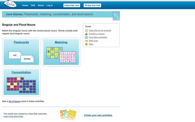 Three interactive activities with plural and singular nouns. The first is a series of flashcards for students to see the singular form of a noun on one side and the plural form of the same noun on the other. The second is a matching game...