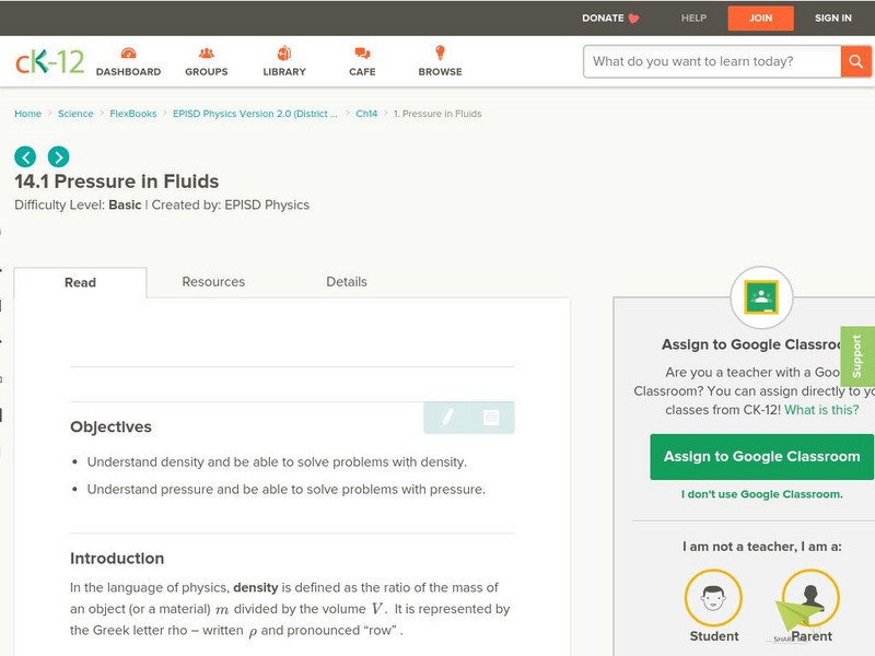 [Free Registration/Login may be required to access all resource tools.] Students will develop an understanding of density and pressure, and how to solve problems involving them.