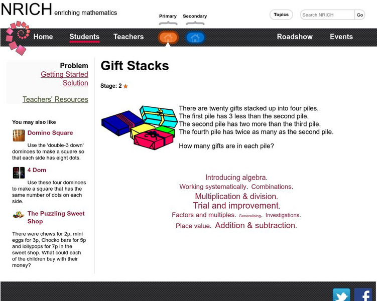 Figure out how many gifts are in each stack using the clues that are given. The solution is available at this one page website.