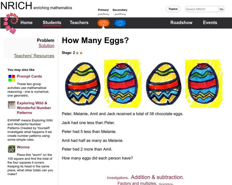 Use the clues at this one page website to figure out just how many chocolate eggs each child will receive. The solution is available when you figure it out.
