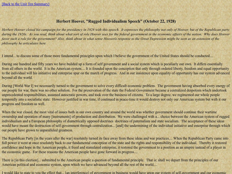 Herbert Hoover closed his 1928 presidential campaign with this speech, an expression of the Republican Party's philosophy of rugged individualism.