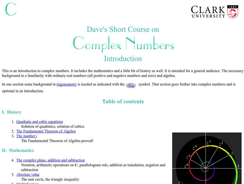 This site from a professor at Clark University teaches you about complex numbers.