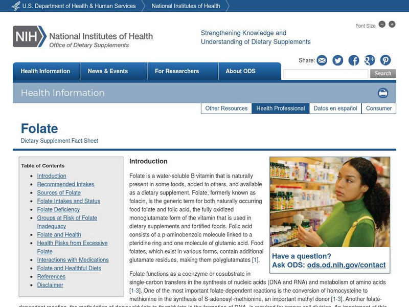 A dietary supplement fact sheet about folate, which is also known as folic acid or vitamin B9. Learn about how this vitamin functions in the human body and how the body reacts when there is a vitamin deficiency or overdose. Providing...