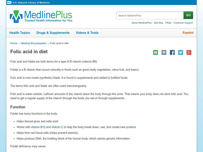 This brief article on folic acid, or folate, is organized into the following sections: "Alternative names," "Definition," "Function," "Food Sources," "Side Effects," and "Recommendation."