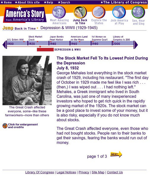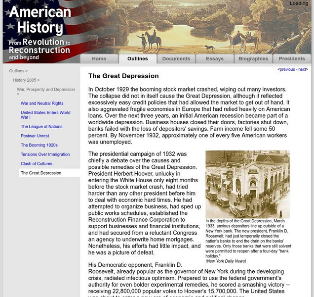 A multi-page site that focuses on the effects of the Great Depression primarily in rural America in the early days before the election of Franklin Roosevelt. Find videos interviews with those who lived through the trying times.