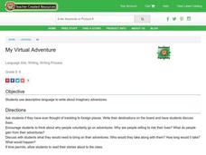 Students write a story. In this adventure story lesson, students discuss various destinations they would like to travel to. Students think about the reasons people take adventures, what they would need to bring, who they would take and...