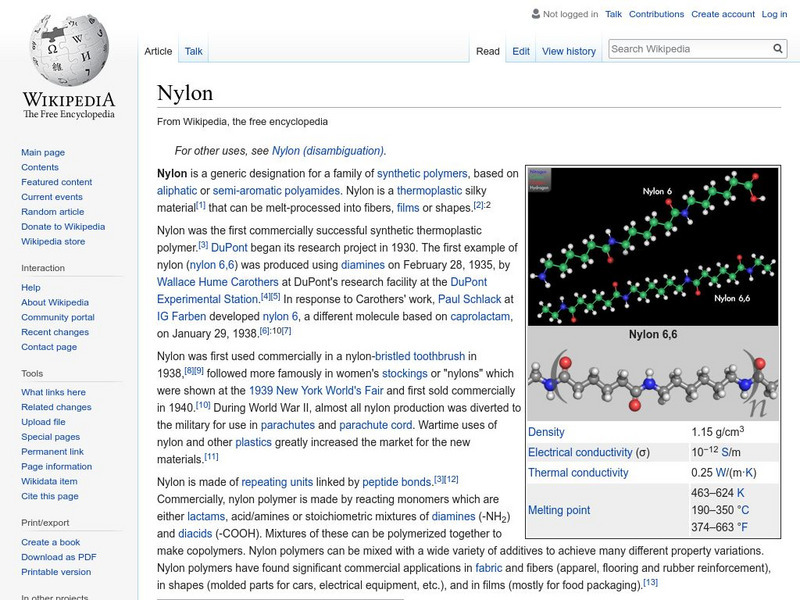Wikipedia provides detailed information on nylon, a synthetic polymer. Includes nylon's uses, history, and products.