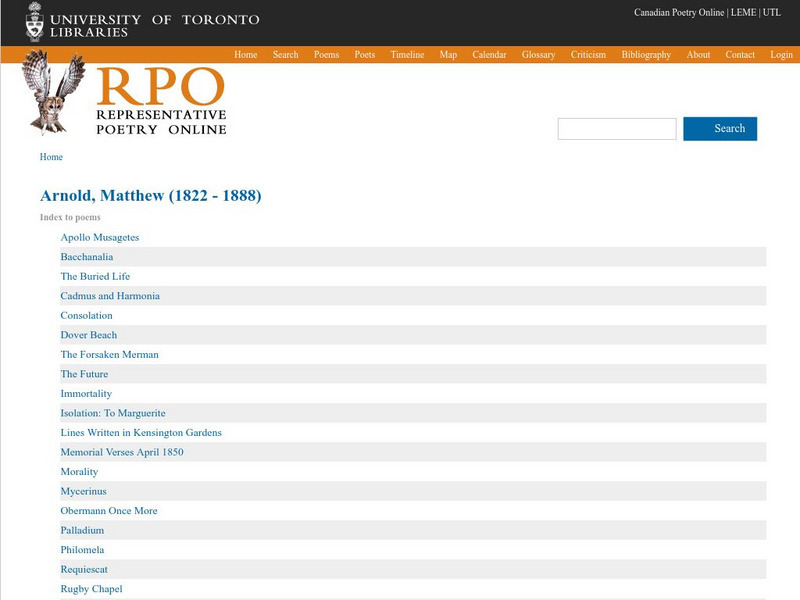 This site provides full texts of 29 poems and the prose work "The Function of Criticism at the Present Time" (1865) by Matthew Arnold (1822-1888).
