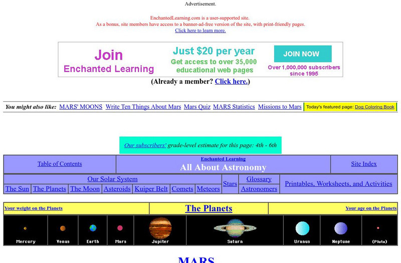 Many facts about Mars are presented on this comprehensive site. Planet size, surface, length of day, orbit, atmosphere, moons, are a sampling of the many topics discussed on this site. You will also find an activity book, a quiz, a...