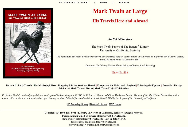 This site provides extensive information on the author Mark Twain (Samuel Clemens) and his travels here and abroad. The site is broken up into sections that are easily accessed from the first page. This site is full of wonderful...