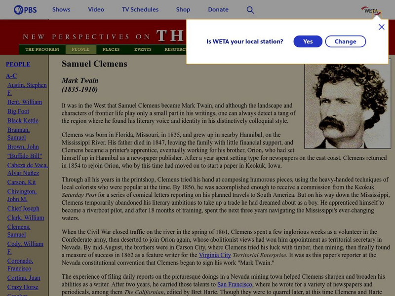 This PBS site provides a very good biography of Samuel Clemens/Mark Twain (1835-1910) with emphasis put on the time he spent in the west. Also includes a photo.
