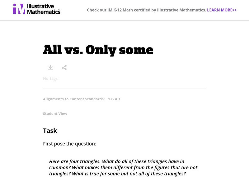 In this lesson, students come up with statements that is true about all of the triangles that they see but not true of all triangles in general, then the teacher should ask students if they can imagine a triangle without that attribute.:...