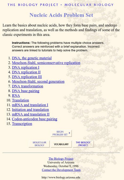 Interactive resource provides students with an opportunity to work through a problem set over nucleic acids. Correct answers are reinforced with a brief explanation. Incorrect answers are linked to tutorials to help solve the problem.