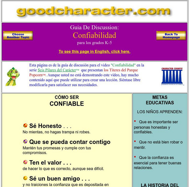 How can you be trustworthy? Use this Spanish version to find simple ways to be a trustworthy person, discussion questions, and activity ideas. This website accompanies a video from "The Six Pillars of Character" video series, but can be...