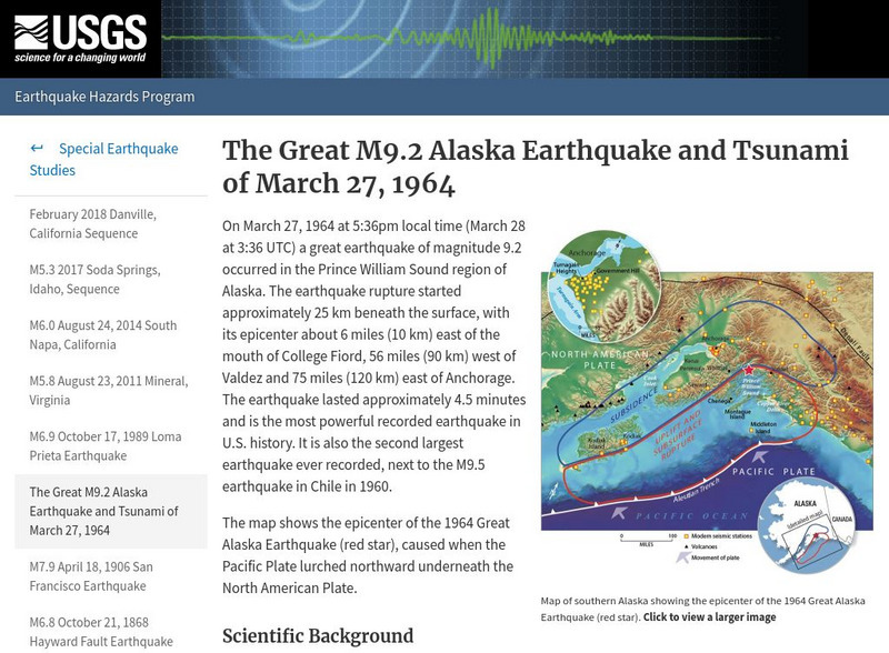 Alaska is part of the Pacific Ring where there are many earthquakes. Basic information about the 1964 Alaskan earthquake is provided, including landslides and liquefaction information, an embedded link to the text of a radio announcement...