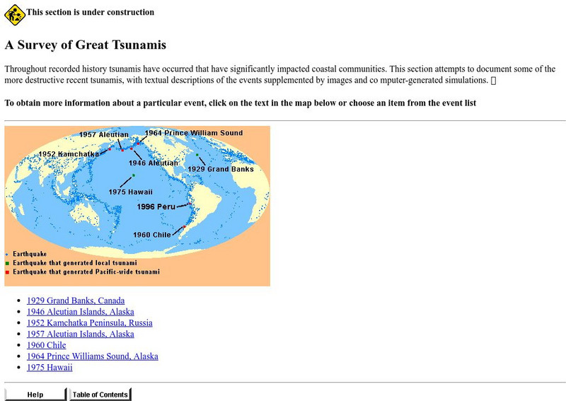 This resource opens up with a clickable map that will provide information on eight different tsunamis, such as the 1929 Grand Banks tsunami, the 1975 Hawaiian tsunami, and several others. Basic information and the damage caused by each...