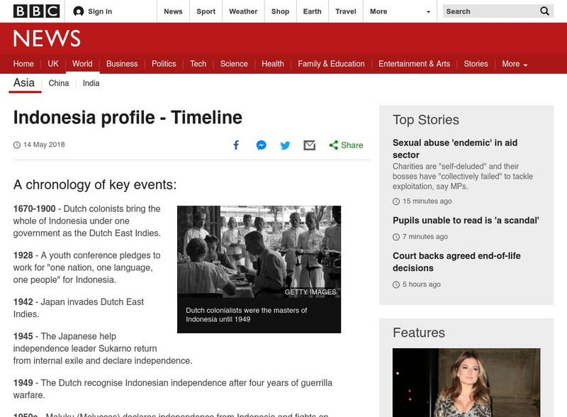 This timeline from BBC News offers a chronology of important events in Indonesia/'s history. You can listen to some of these events and watch videos of others.