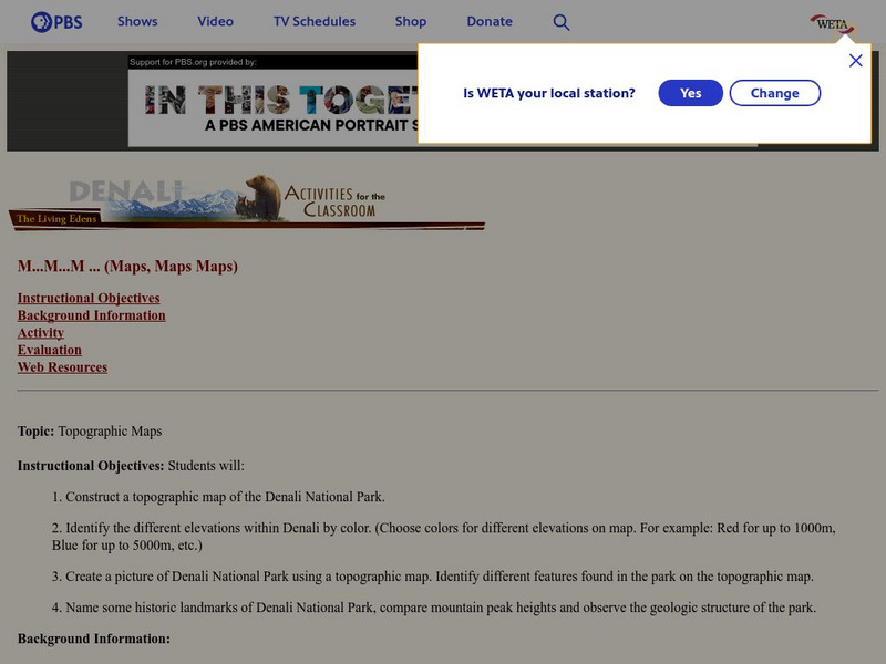 This is an online activity on Topographic maps with stated objectives, an activity, background information, evaluation, and resources. This site has information on where you can adjust the activity for elementary or secondary age levels.