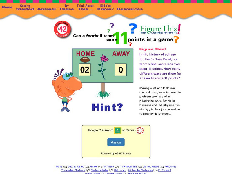 A math challenge taken directly from the sports pages. Use your problem solving and data collection aptitude to find out how many different ways a Rose Bowl team could score 11 points. Try this one page activity from the NCTM Math...