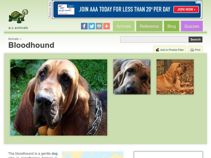 Illustrated entry summarizes the temperament of Bloodhounds while offering statistics and details on the breed's value as a pet.