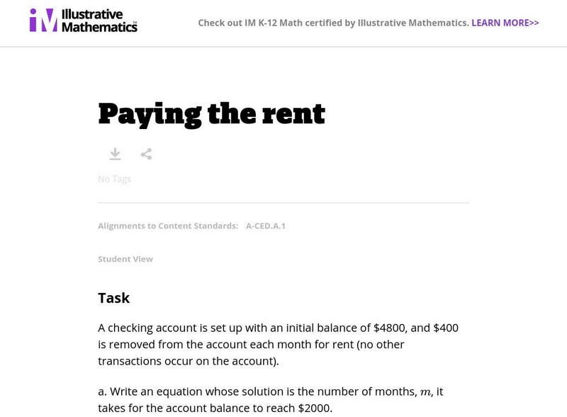 A checking account is set up with an initial balance of $4800, and $400 is removed from the account each month for rent (no other transactions occur on the account). Aligns with A-CED.A.1.