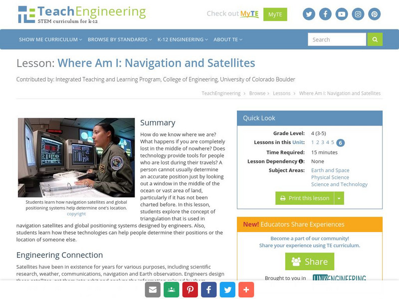 How do we know where we are? In this lesson, students explore the concept of triangulation that is used in navigation satellites and global positioning systems designed by engineers. Also, students learn how these technologies can help...