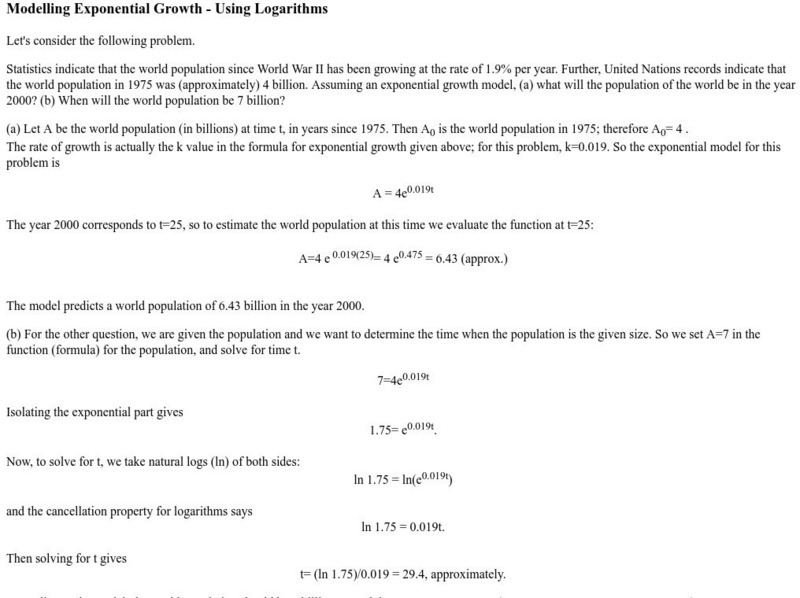 This site shows how to model exponential growth. The site walks the student through an example problem using logarithms to find the exponential growth of the theoretical world population.