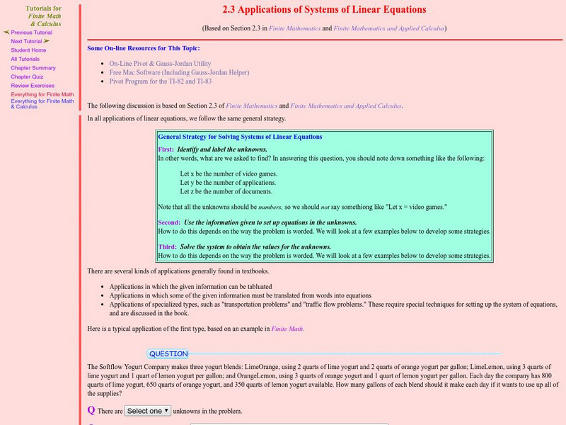 Here is a site that clearly and thoroughly explains how to solve word problems that lead to systems of equations, such as mixture, coin, investment, and upstream/downstream problems. There are example problems solved, problems for the...
