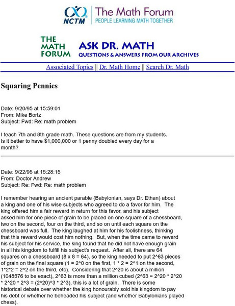 The Math Forum: Ask Dr. Math: Squaring Pennies