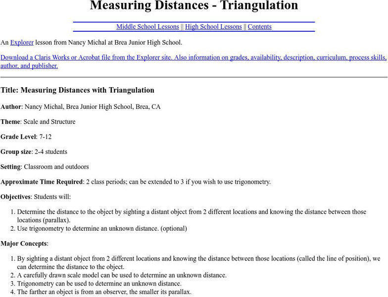 Lesson plan which details how to have learners determine the distance to an object by sighting it from two different locations and knowing the distance between these locations. As an advanced alternative, trigonometry can be used to...