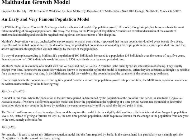 This site from St. Olaf College provides great information on the Malthusian Model for population growth. Great factual text is given, along with formulas and examples to increase the learning on the subject.