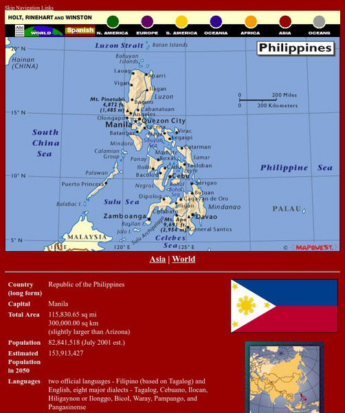 This map of the Philippines from MapQuest is a clear map labeling the cities, islands, and physical features. There is also a chart of some quick facts about the country.