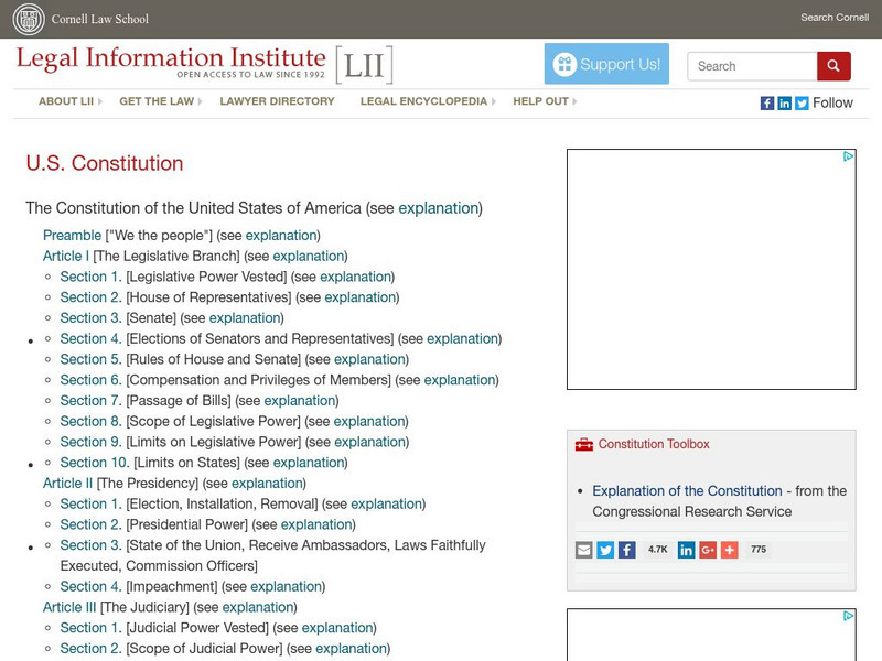 The Constitution of the United States is provided by the Legal Information Institute of Cornell University of Law.