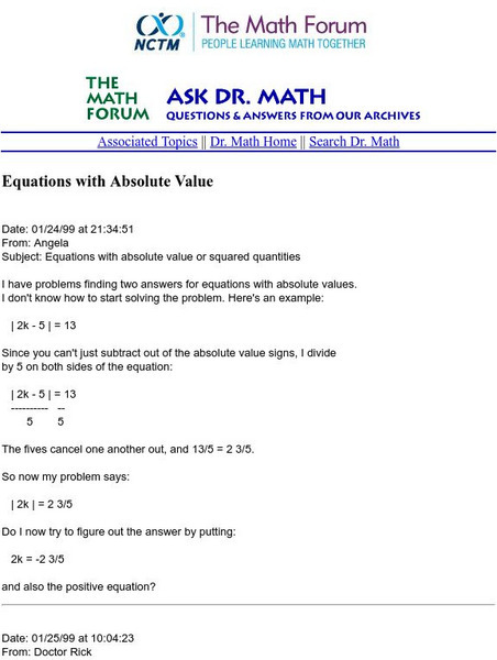The Math Forum: Ask Dr. Math: Equations With Absolute Value