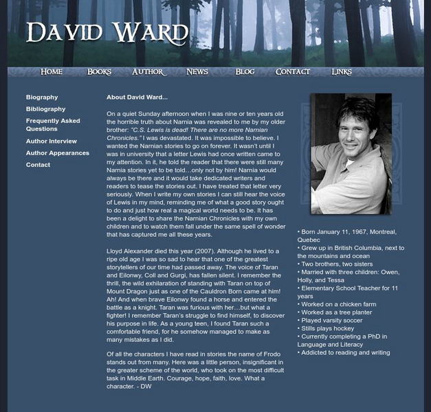 David Ward is a Canadian author of novels for junior and intermediate students. In some of his novels he creates imaginary worlds, such as in his trilogy about a place called Grassland. This is his website where you will find a biography...