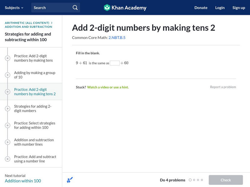 In this exercise, students practice adding two-digit numbers by making tens. Students receive immediate feedback and have the opportunity to watch tutorial videos, get hints, and try questions repeatedly.